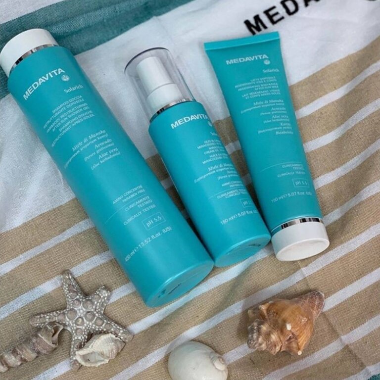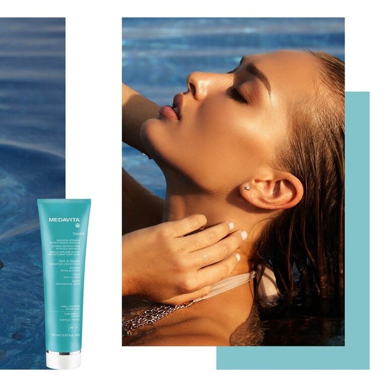 Le Masque intensif restructurant "Solarich" de Medavita nourrit et hydrate la fibre capillaire stressée par des agents atmosphériques (soleil, sel, vent) et par le chlore, grâce à ses propriétés intensément démêlantes. Convient à quiconque aime passer du temps au soleil et à l'extérieur. Ce traitement contient du miel de Manuka, de l’huile d’Avocat, de l’huile de Noix de coco, du beurre de Karité et le complexe Amino Concentré.