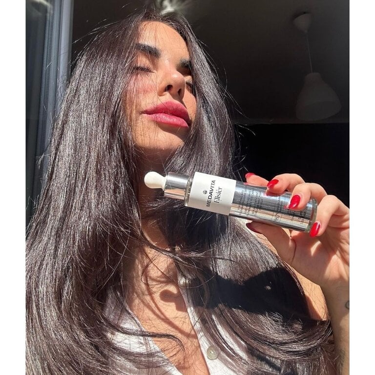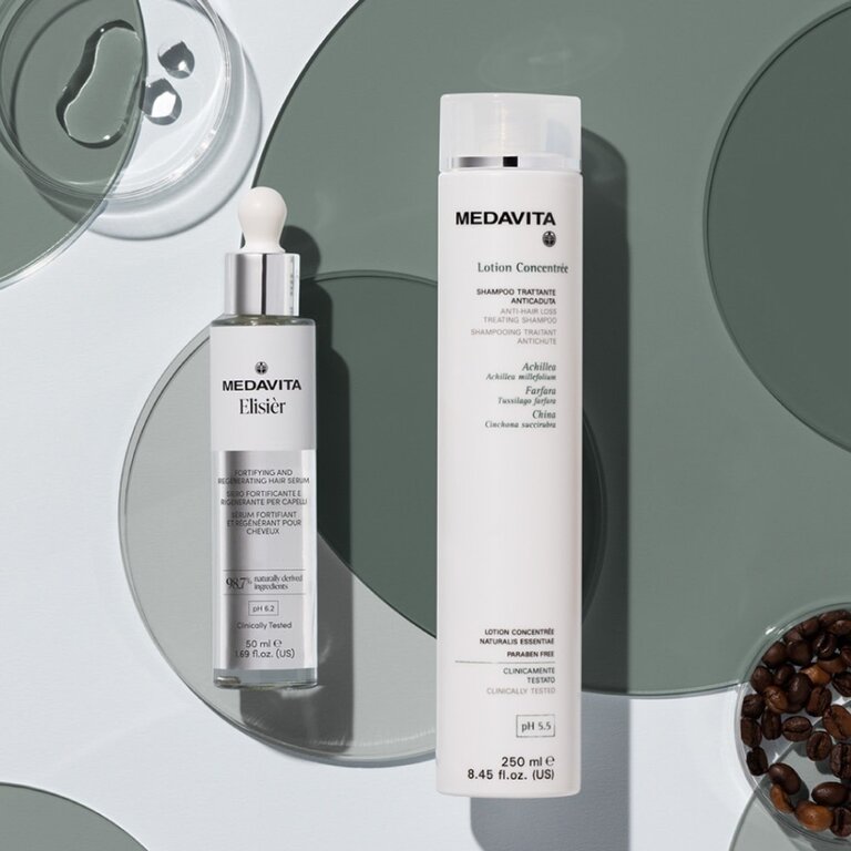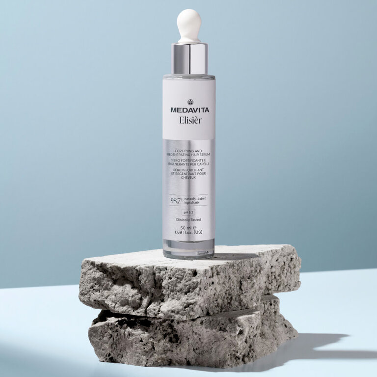 Le sérum fortifiant et régénérant "Elisièr" de Medavita augmente la force, la résilience, la brillance et le volume des cheveux, préservant leur vitalité et leur beauté dans le temps. Convenant à tous les types de cuir chevelu, ceux ayant tendance à se dégarnir et à la chute de cheveux peuvent tirer un grand bénéfice de ce soin quotidien ciblé. Fait de 98,7% d'ingrédients naturels, il stimule et préserve le potentiel énergétique dont les cellules du cuir chevelu ont besoin pour prospérer et fonctionner au mieux à tout âge. Grâce à ses principes actifs puissants, l’activité folliculaire s’améliore déjà 6 heures après l’application et jour après jour, la fibre capillaire retrouve volume et les cheveux sont plus forts, plus épais et plus brillants.
