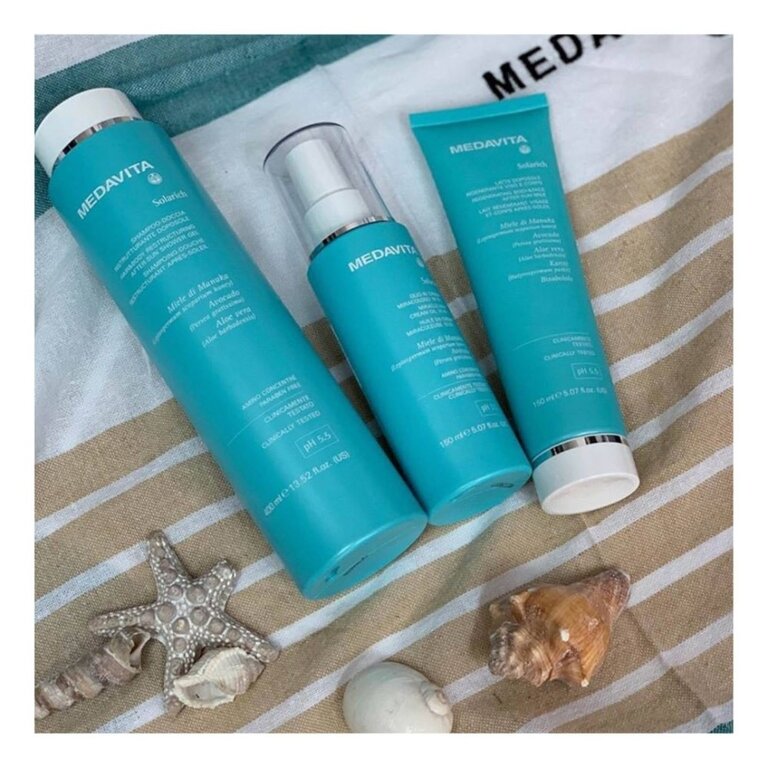 Le shampoing-douche "Solarich" de Medavita est idéal après l'exposition au Soleil. Il apaise, tonifie et rafraîchit en plus d'aider à préserver le bronzage. Solarich permet de rétablir l'équilibre du cuir chevelu et des cheveux soumis au stress des agents atmosphériques (soleil, sel, vent), du chlore et de l’activité sportive. Sa formulation contient du miel de Manuka, de l’huile d’Avocat, de l’Aloe vera, de l’Allantoïne, des protéines de Collagène et le complexe Amino Concentré.
