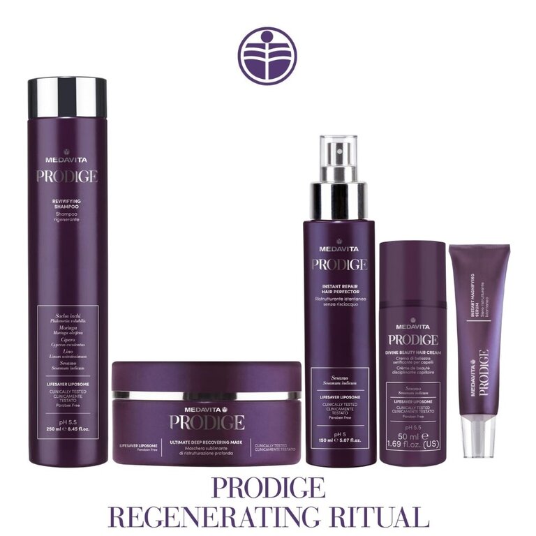 Rincer abondamment et poursuivre avec le masque régénérant Prodige de Medavita.