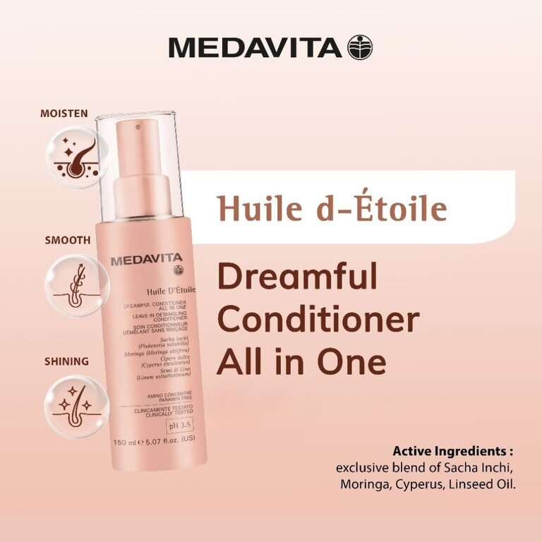 Le soin démêlant sans rinçage 10 en 1 Huile d'Étoile "Dreamful All In One Leave-in Conditioner" de Medavita est un spray multi-tâches conçu pour embellir tous les types de cheveux au quotidien. Sa formule légère et riche adoucit la chevelure sans l'alourdir, la laissant nourrie, douce et éclatante.