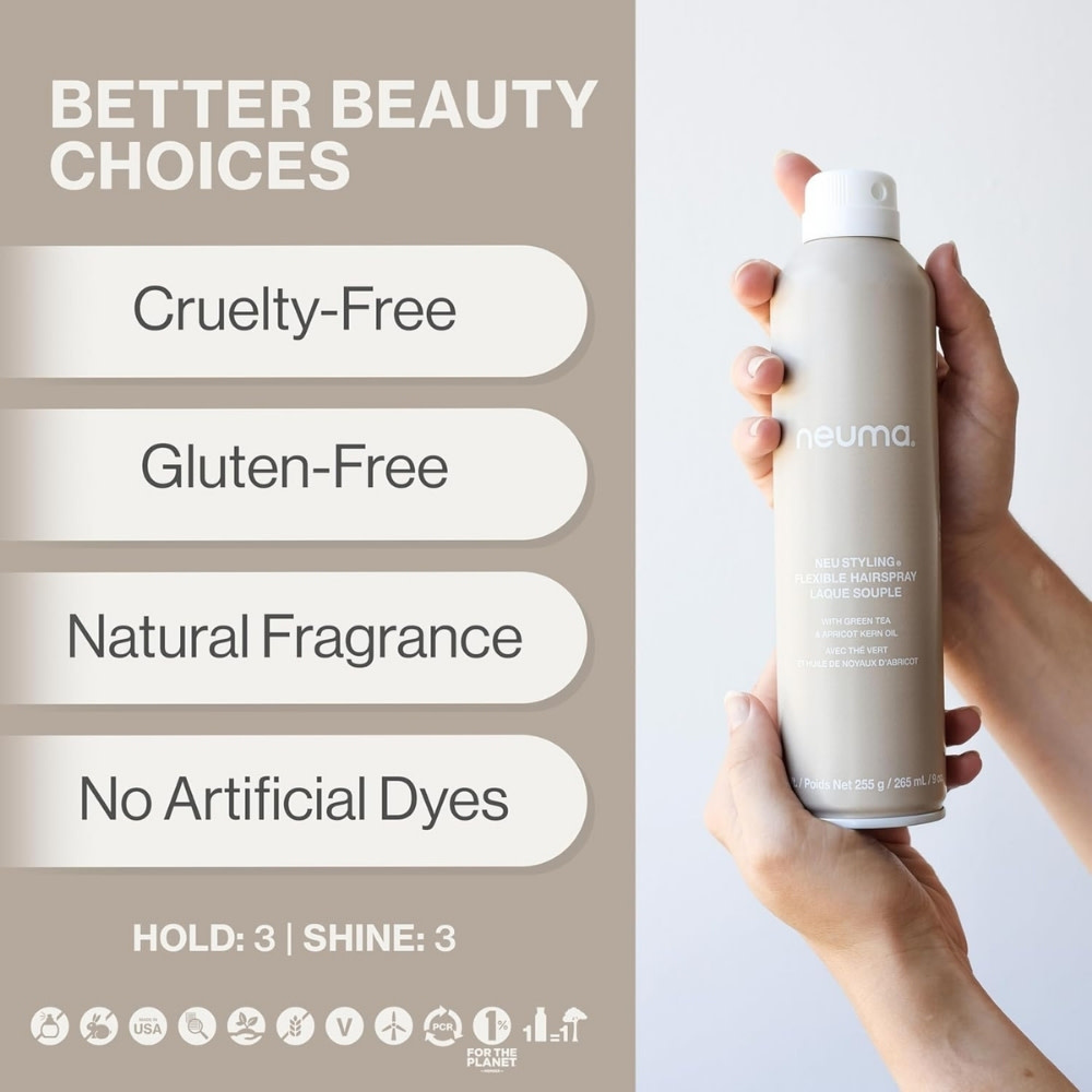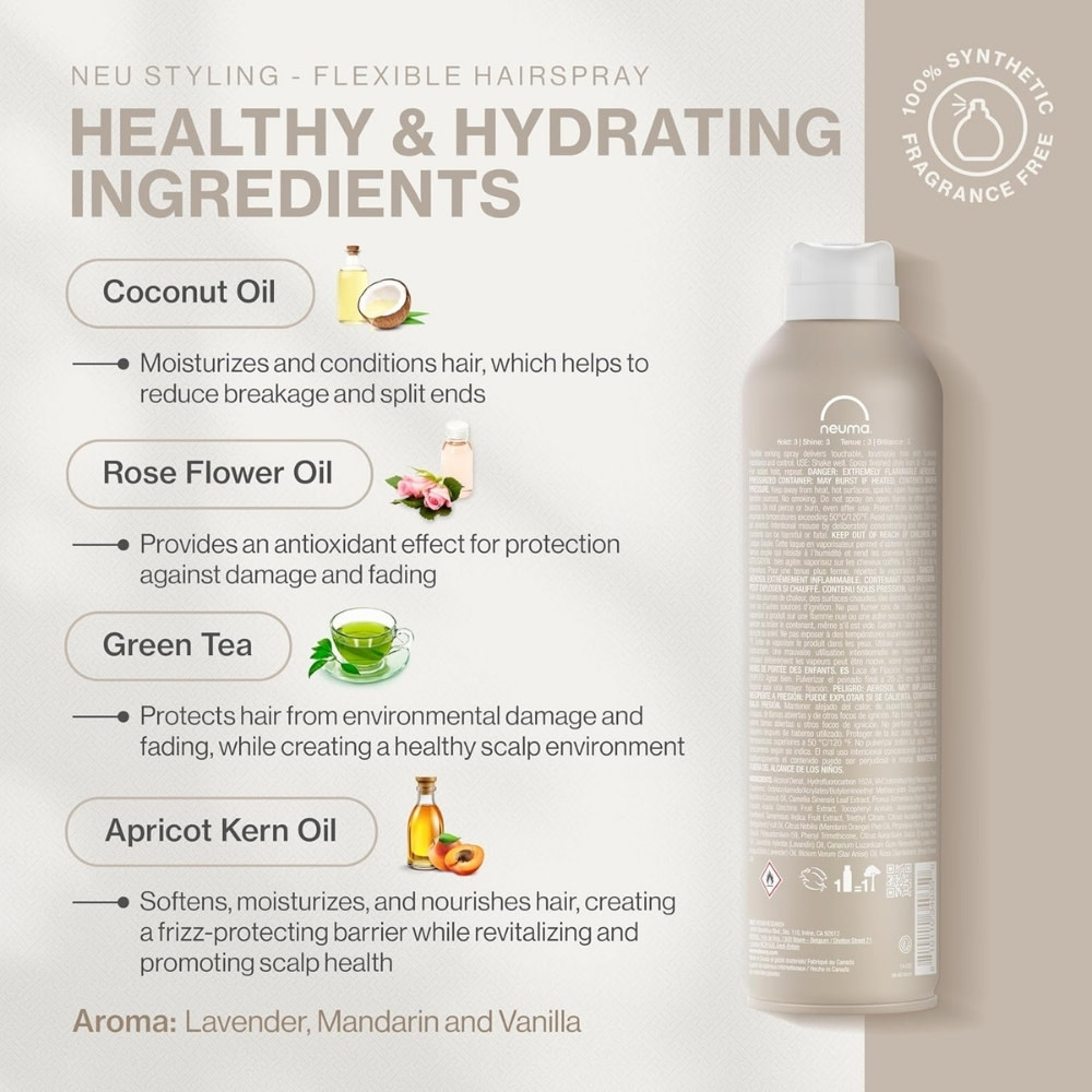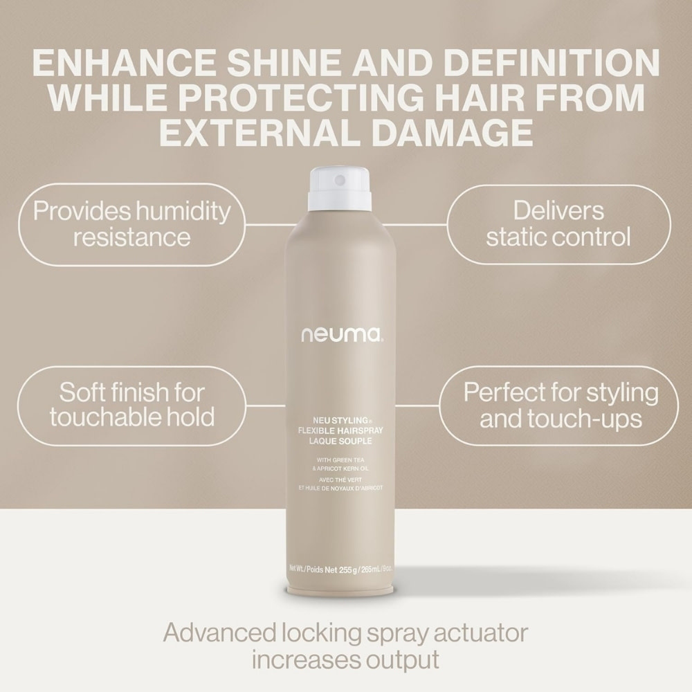 S'inscrireFixatif souple "Neu Styling Flexible Hairspray" avec thé vert et huile de noyaux d'abricot - Tenue flexible et résistante à l'humidité (265ml/9.0oz)