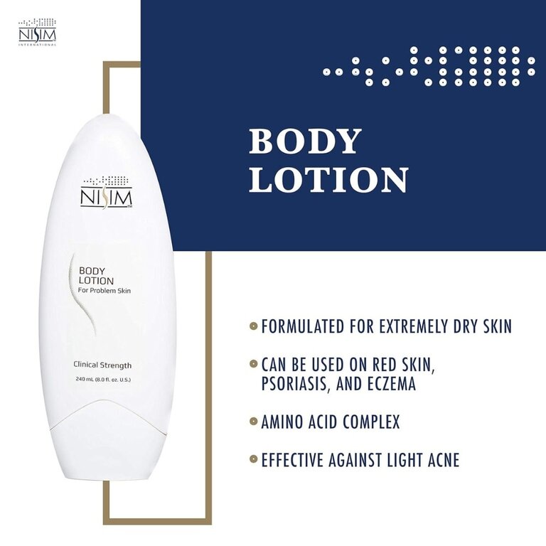 La lotion pour le corps "Body Lotion" de Nisim est cliniquement efficace pour les peaux à problèmes, qu'elles soient sèches, sensibles, sujettes aux irritations ou à des affections cutanées spécifiques comme l'eczéma ou le psoriasis. Cette lotion hydratante et apaisante vise à restaurer le confort cutané et à améliorer l'apparence générale de la peau.