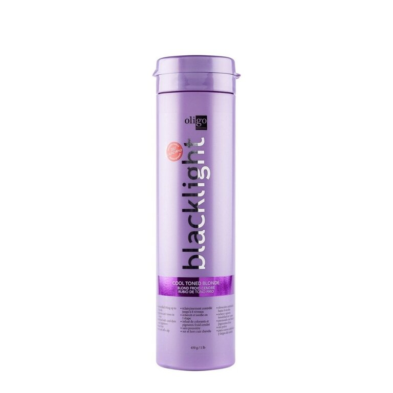 La poudre décolorante Blacklight sans poussière éclaircit jusqu’à 8 niveaux et tonifie en une seule étape. Sa formule est infusée de colorants et pigments puissants qui neutralisent les tons indésirables pour offrir un magnifique blond froid cendré.