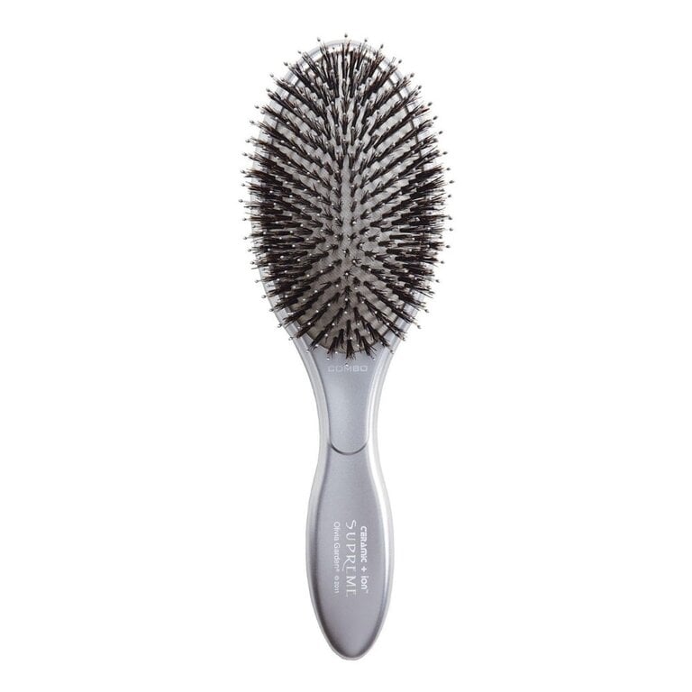 La brosse Olivia Garden "Ceramic + Ion Supreme Styler" est une brosse professionnelle conçue pour démêler, lisser et coiffer en douceur. Elle combine des poils de sanglier naturels et des poils de nylon ioniques, un mélange idéal pour offrir à la fois un démêlage efficace et une finition brillante. Les poils de sanglier aident à répartir les huiles naturelles du cuir chevelu sur les longueurs, ce qui apporte douceur et éclat, tandis que veux de nylon facilitent la pénétration dans la chevelure et réduisent l’électricité statique.