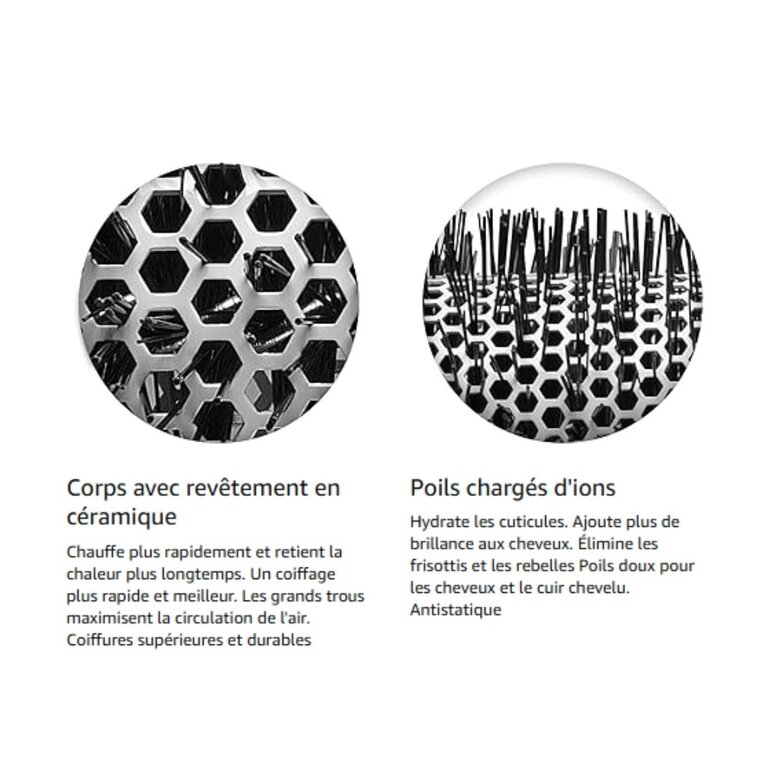 • Céramique : Elle permet au barillet de chauffer rapidement et uniformément. Elle répartit bien la chaleur, ce qui accélère le séchage des cheveux. Cela aide à fixer la forme du brushing plus facilement et à obtenir un résultat plus durable.