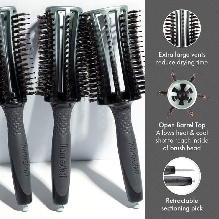 Les brosse ronde ventilée "ThermoVent" aux poils ioniques et de sanglier de Olivia Garden allient performance et soin des cheveux. Leur barillet ventilé optimise la circulation de l’air pour accélérer le séchage tout en réduisant les dommages.