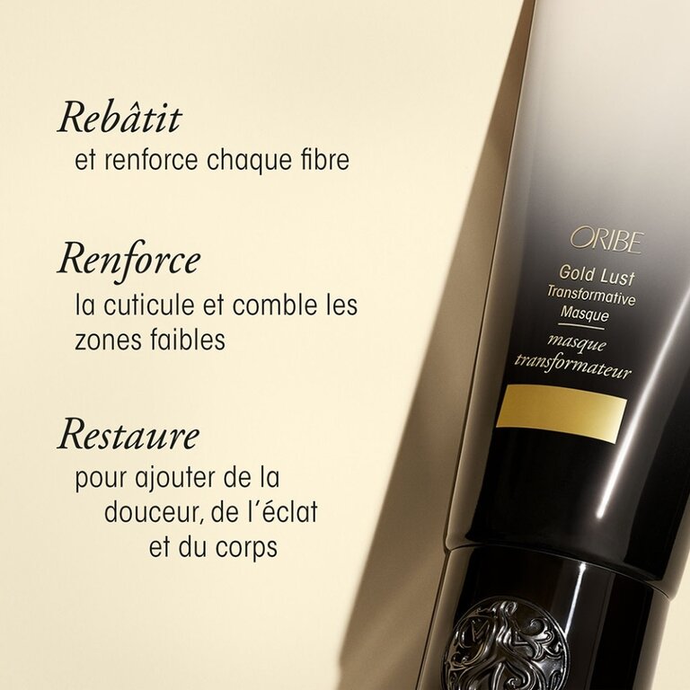 Le masque transformateur "Gold Lust" de Oribe régénère les cheveux surmenés à un état de jeunesse. Ce soin intensif riche en nutriments restaure la douceur, la brillance et la souplesse des cheveux affaiblis par le temps et ce à chaque application. Il est une fontaine de jouvence pour les cheveux grâce à sa formule riche en biotine, en antioxydants et en protéines qui pénètre et renforce chaque mèche de l'intérieur vers l'extérieur.