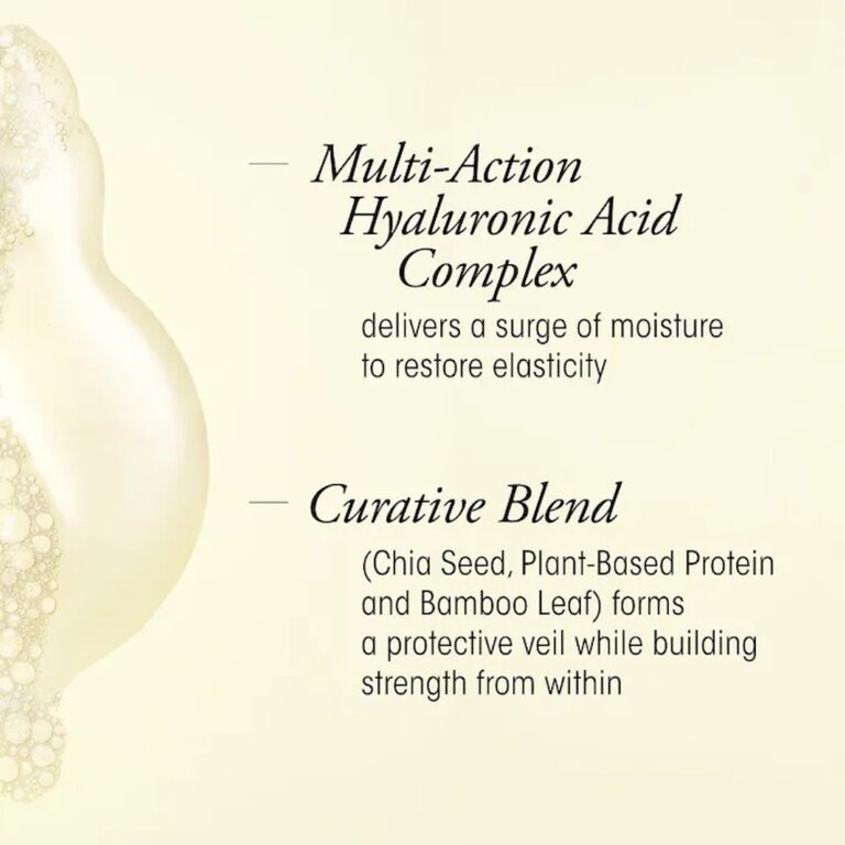 - Complexe d'acide hyaluronique multiaction : se réhydrate de l'intérieur pour fournir une poussée d'hydratation et augmenter l'élasticité.