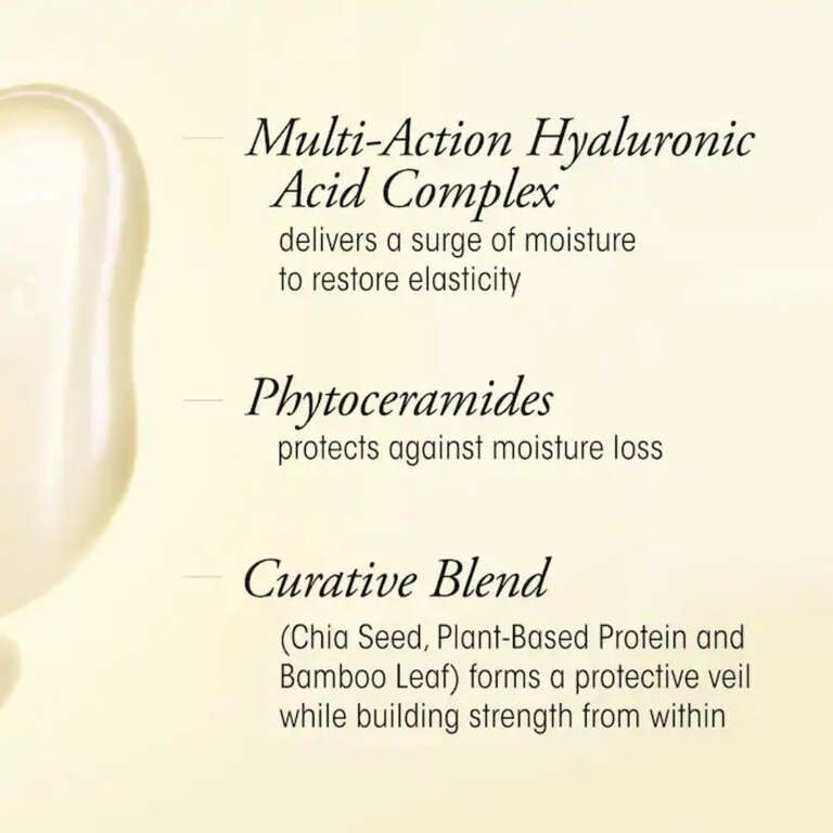 - Complexe d'acide hyaluronique multiaction : fournit une poussée d'hydratation et augmente l'élasticité.