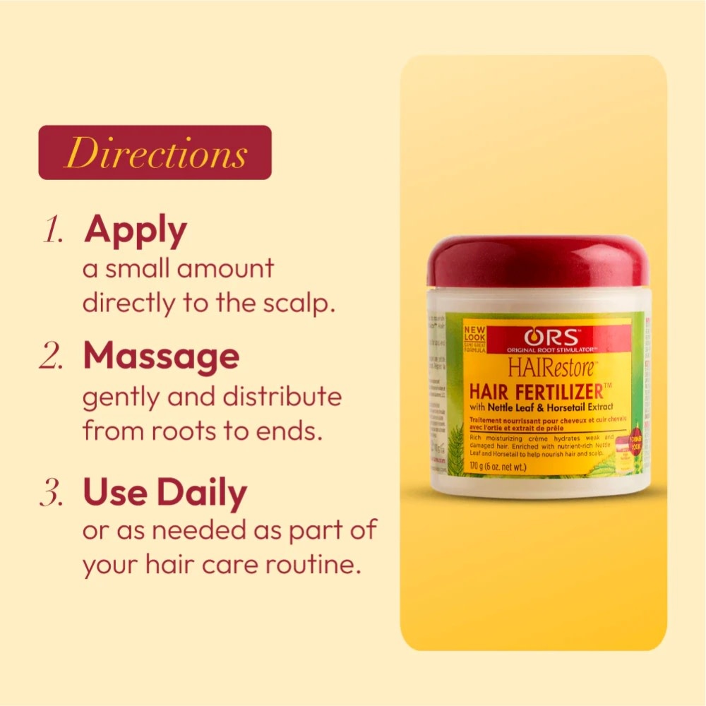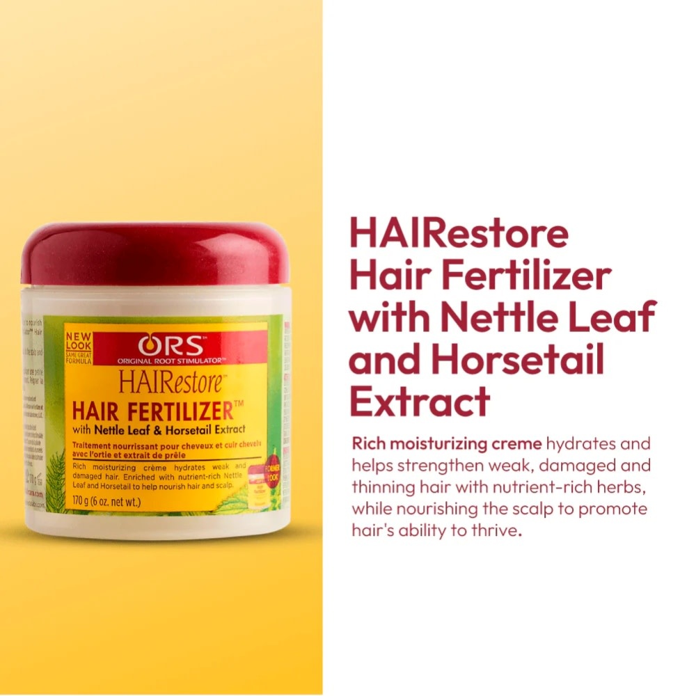 Le traitement nourrissant "HAIRestore Hair Fertilizer" de ORS est une crème riche conçue pour revitaliser le cuir chevelu et favoriser une croissance capillaire saine. Enrichi en extraits d’ortie et de prêle ainsi qu’en huiles nourrissantes, il hydrate intensément, apaise les irritations et renforce les cheveux fragiles tout en réduisant la casse. Idéal pour les cheveux secs, abîmés ou clairsemés, il convient aussi parfaitement aux coiffures protectrices, aidant à maintenir un cuir chevelu sain et des cheveux plus forts au quotidien.