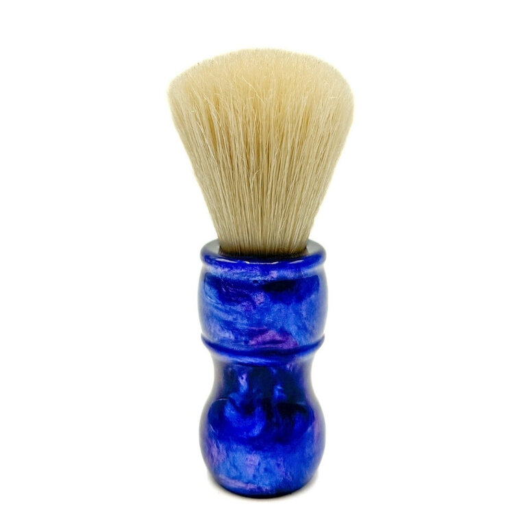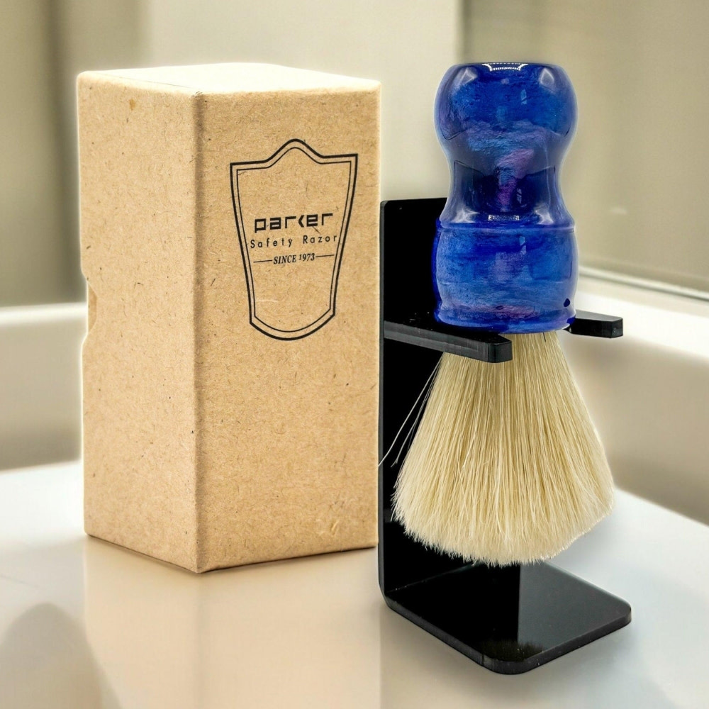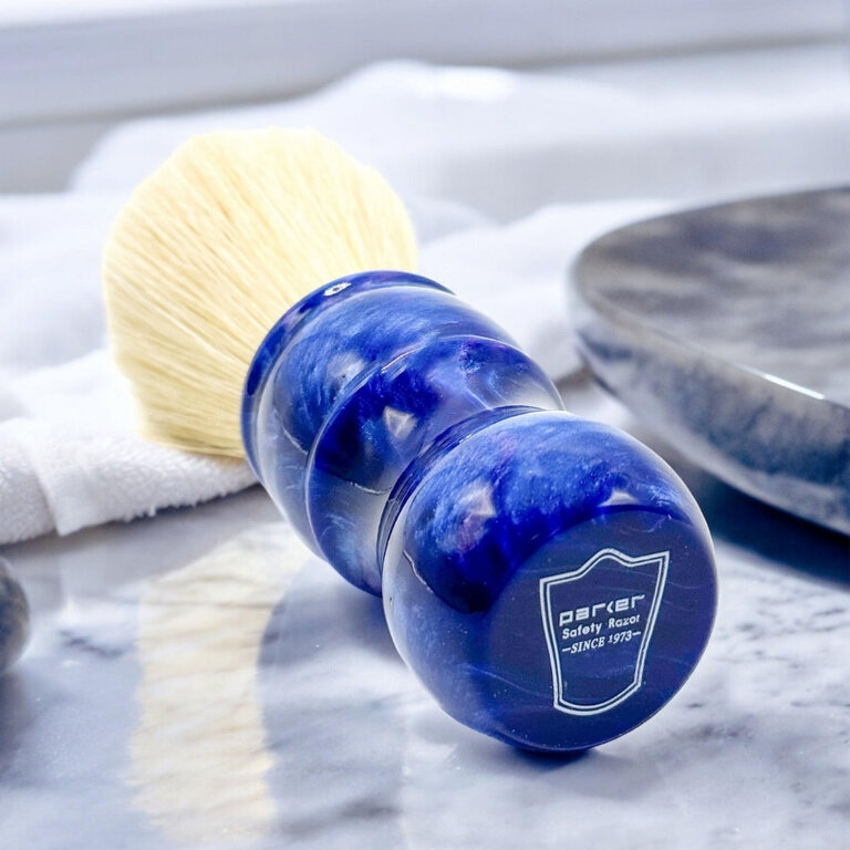 Son manche en résine irisée bleue, élégant, brillant et ergonomique, assure une prise en main stable et un excellent contrôle. Robuste, performant et durable, ce blaireau constitue un choix d’excellence pour les barbiers professionnels et les utilisateurs expérimentés recherchant une expérience de rasage traditionnelle efficace.