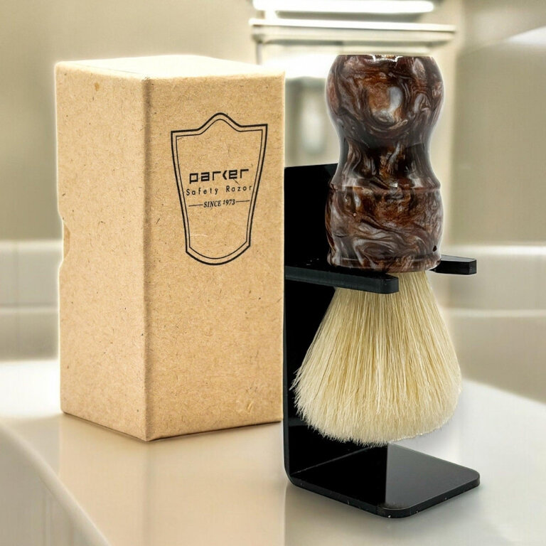 Son manche en résine irisée effet écaille tortoise, brillant, élégant et ergonomique, assure une prise en main confortable et un excellent contrôle. Robuste, performant et fidèle au savoir‑faire Parker, ce blaireau convient autant aux barbiers professionnels qu’aux utilisateurs expérimentés recherchant une expérience de rasage traditionnelle et efficace.