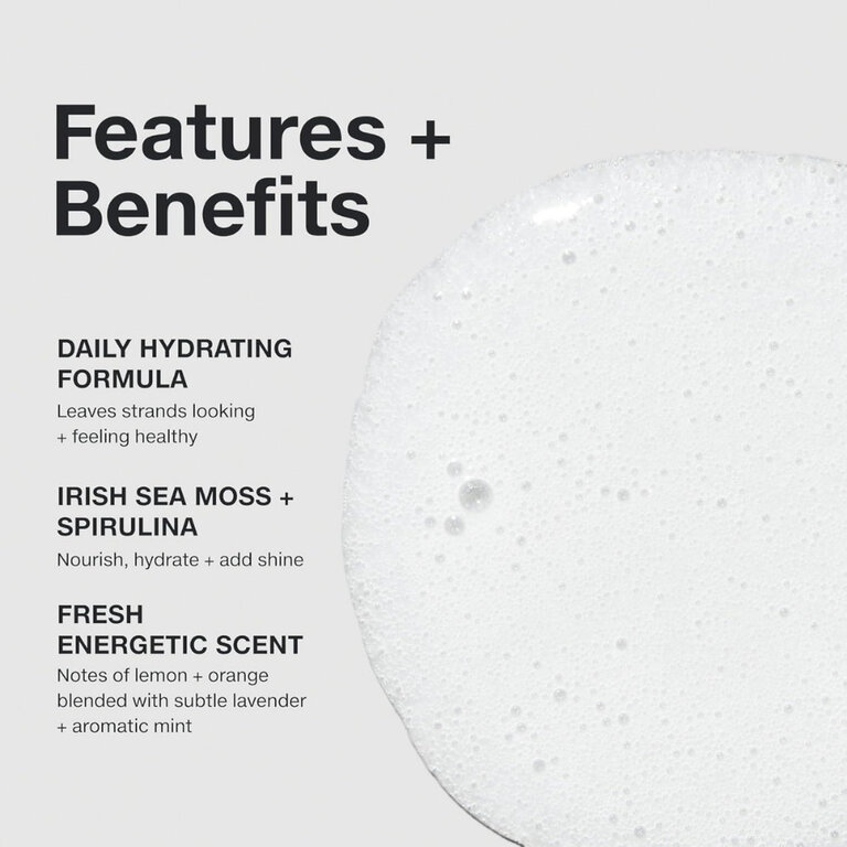 - Mousse de mer d'Irlande et spiruline : Issus de sources durables, ses actifs hydratent et ravivent les cheveux secs tout en augmentant la brillance et en aidant à prévenir les dommages.