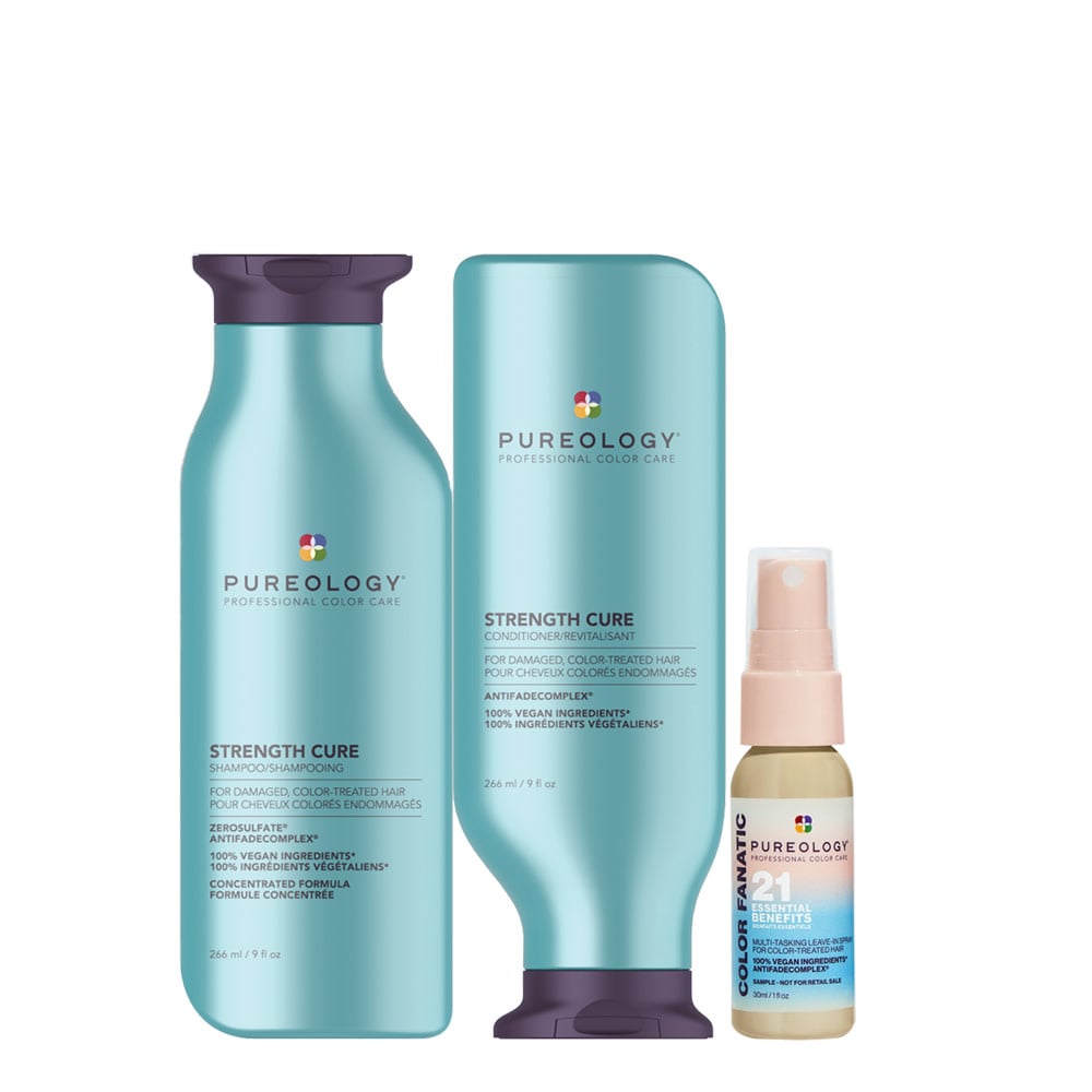 Le shampoing fortifiant "Strength Cure" de Pureology est doux et riche en mousse. Il fortifie et aide à réparer les cheveux colorés abîmés par le coiffage à chaud, l'usure physique ou le traitement excessif.