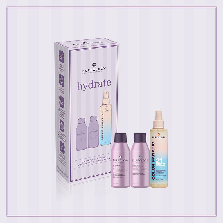Plongez dans l'univers somptueux de Color Fanatic et laissez-vous envelopper par le pouvoir de transformation du trio hydratant multi-bienfaits "Hydrate" de Pureology. Le shampoing et revitalisant Hydrate de Pureology est le secret pour des cheveux doux, éclatants et une couleur protégée, peu importe où vous allez. Le soin sans rinçage "Color Fanatic" offre 21 bienfaits pour vos cheveux. Il les prépare et les protège de la chaleur, les démêle et les fait briller, de la racine à la pointe.