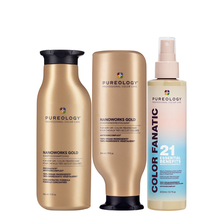 Offrez à vos cheveux secs, rêches et ternes une nouvelle vie avec le trio régénérant "Nanoworks Gold" de Pureology. Cette routine de soins innovante agit en profondeur pour redonner douceur, souplesse et brillance. Le shampoing et le revitalisant "NanoWorks Gold" infusent une puissante dose de nutrition et d'antioxydants à votre chevelure. Ils assouplissent les cheveux très secs et rêches, les laissant visiblement revitalisés et rajeunis. Le spray sans rinçage "Color Fanatic" combine 21 fonctions pour prendre soin de votre couleur et de vos cheveux en même temps, en leur apportant une revitalisation intense et une douceur exceptionnelle.