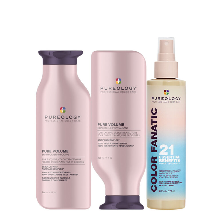 Donnez une nouvelle dimension à vos cheveux fins et colorés avec le trio volumisant "Pure Volume" de Pureology. Cette routine de soins innovante est la solution pour un volume durable et une légèreté sans pareille. Le shampoing et le revitalisant "Pure Volume" infusent vos cheveux d'actifs volumisants pour leur donner plus de corps et de mouvement. Le spray sans rinçage "Color Fanatic" combine 21 fonctions pour prendre soin de votre couleur et de vos cheveux en même temps, en leur apportant une revitalisation intense et une douceur exceptionnelle.