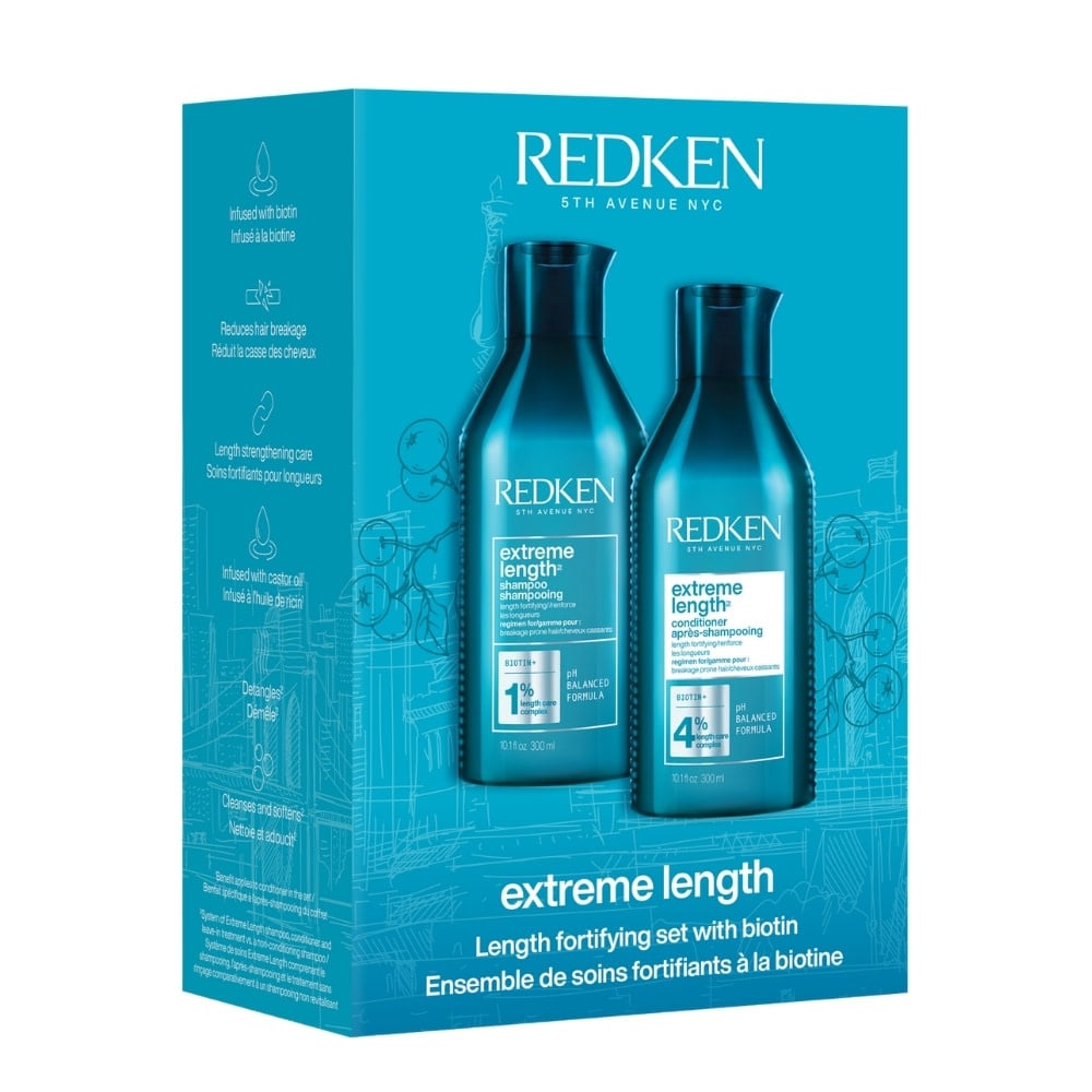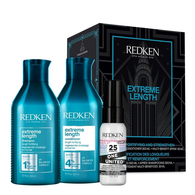 Le duo "Extreme Length" de Redken avec biotine renforce les cheveux abîmés et aide les cheveux à pousser plus longtemps et plus fort. Cet ensemble de 3 produits aide à prévenir la casse pour favoriser vos cheveux les plus forts et les plus sains.