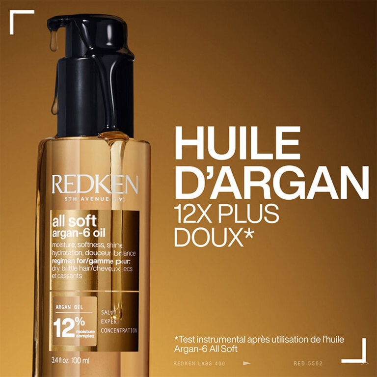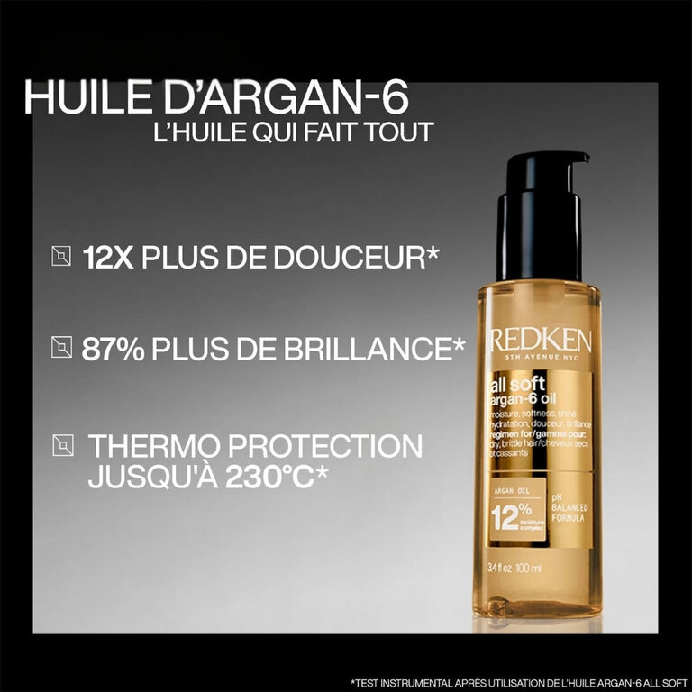 Les bienfaits sont amplifiés lorsque cette huile est utilisée avec le shampoing et le revitalisant "All Soft" de Redken.