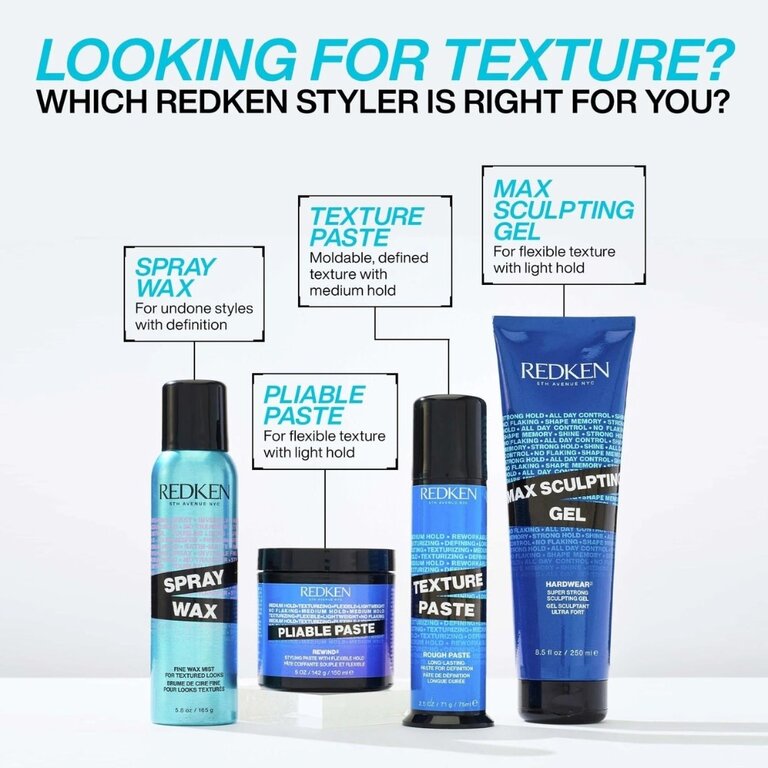 Cette pâte texturisante longue durée de Redken procure définition et souplesse avec un contrôle malléable. Déconstruisez vos coiffures en créant des looks à la texture irrégulière avec une séparation mobile. Coiffer vos cheveux n'aura jamais été aussi amusant et facile avec "Texture Paste". Anciennement appelée "Rough Paste 12", cette pâte présente de nombreux avantages.