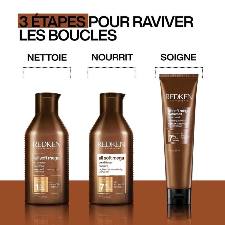 Après avoir fait le shampoing, appliquer sur les cheveux humides dans les longueurs et les pointes. Rincer abondamment. Poursuivre avec le traitement sans rinçage "Hydramelt All Soft Mega Curls".