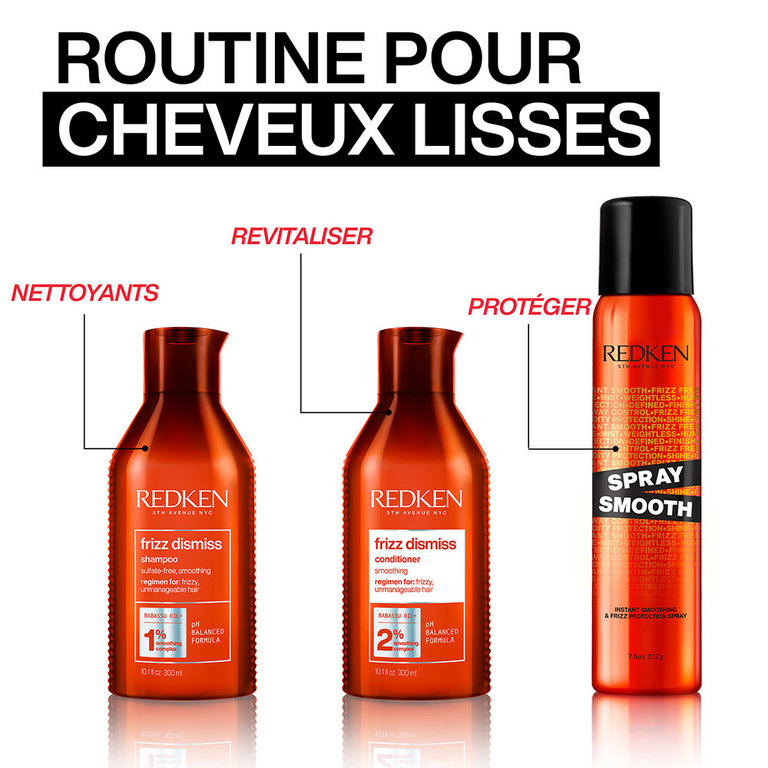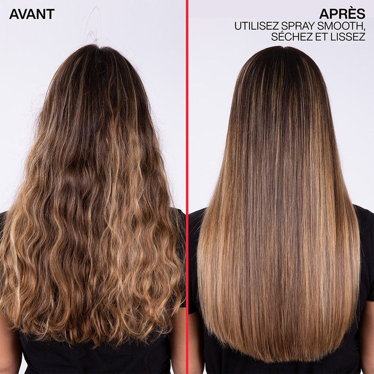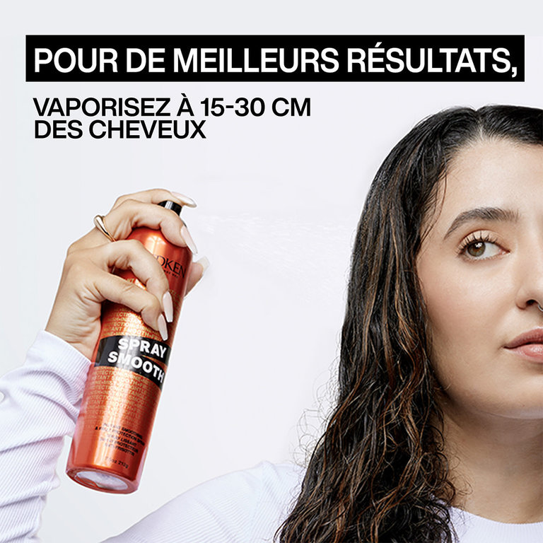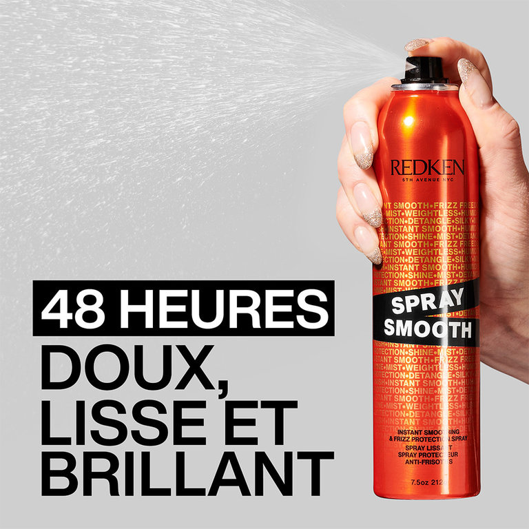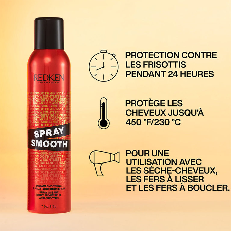 Le spray lissant anti-frisottis "Spray Smooth" de Redken est un aérosol hybride thermoactif qui lisse les cheveux et les rends brillants de façon durable tout en éliminant les frisottis indésirables. Sa formule est exempte de parabènes, de sulfates et de silicone.