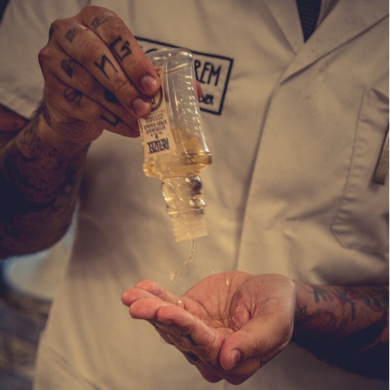 Appliquez l'après-rasage sur les paumes et massez sur les zones fraîchement rasées pour stimuler la peau, resserrer les pores et laisser la peau fraîche et confortable.