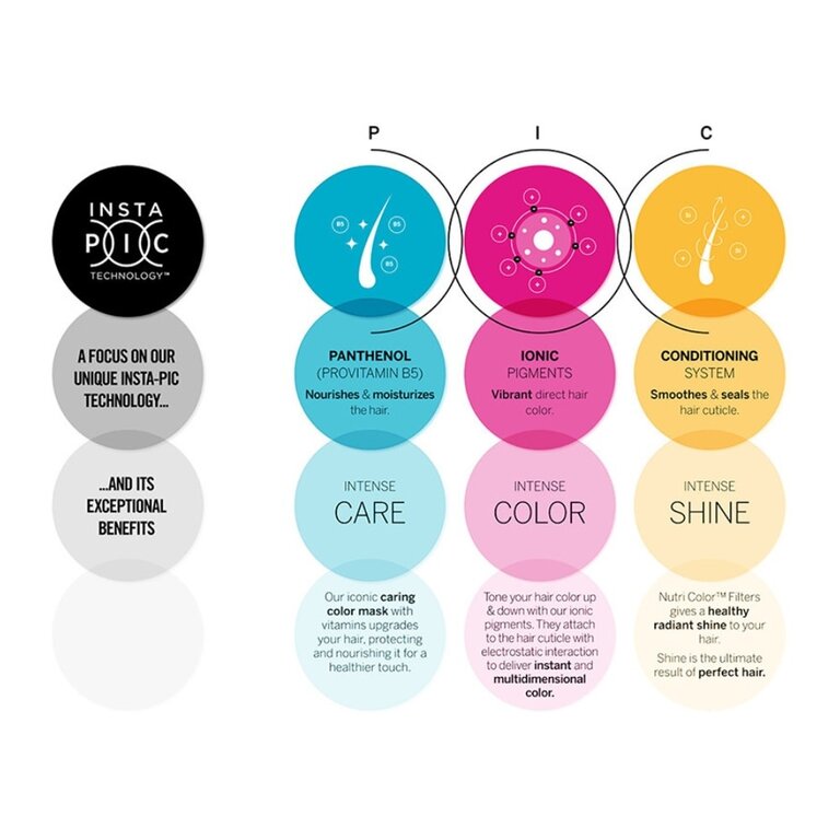 Doté de la technologie "INSTA-PIC" unique qui offre une couleur, un soin et un éclat intense et direct. Celle-ci garantit que le masque "Nutri Color Filters" n'est pas seulement un colorant, mais un cocktail triple action qui optimise la précision de la couleur, le soin intensif et la brillance spectaculaire en un temps record.