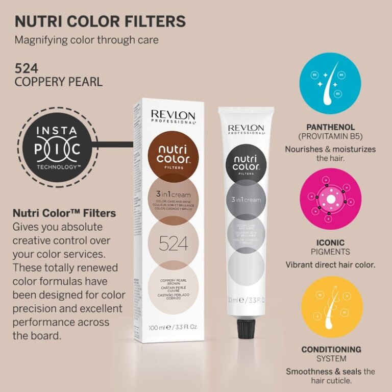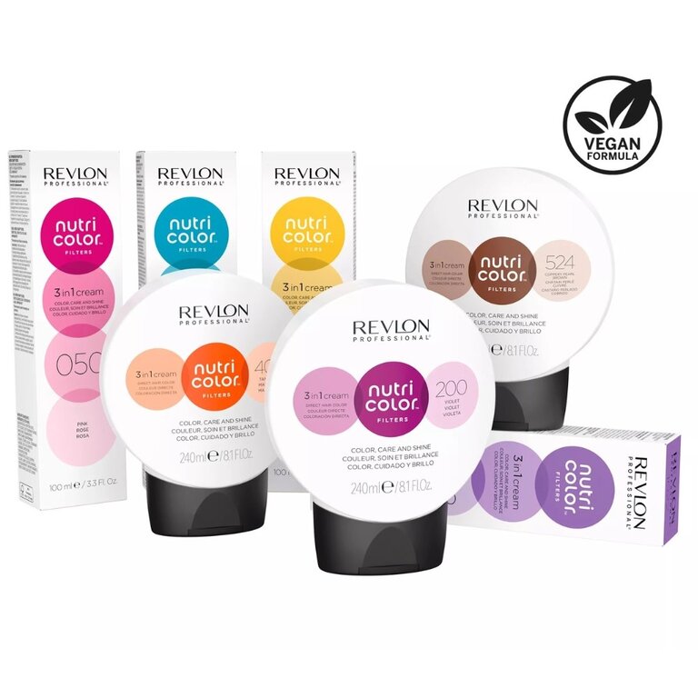 Les crèmes 3 en 1 "Nutri Color Filters" de Revlon Professional sont des masques de coloration semi-permanente qui offrent trois bénéfices essentiels pour les cheveux en un seul produit : Couleur, soin et brillance. Que ce soit pour raviver la couleur entre 2 colorations, pour neutraliser des reflets indésirables ou pour créer de nouvelles nuances. Avec un éventail de 27 couleurs toutes miscibles entre elles, les possibilités sont grandes.
