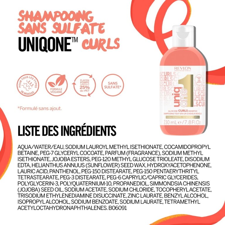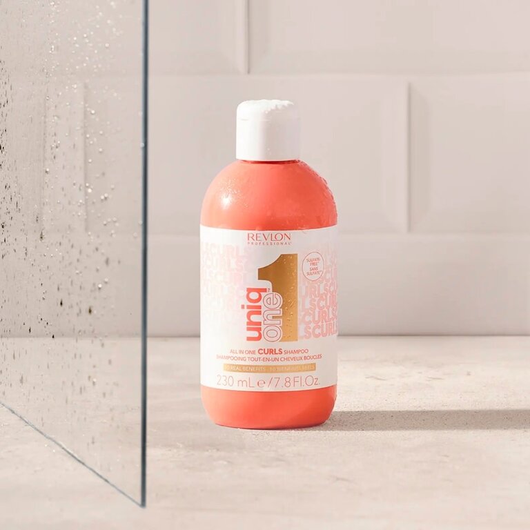 Adoptez de belles boucles avec le shampoing tout-en-un "UniqOne All In One Curls Shampoo" de Revlon Professional qui vous offre 10 bienfaits réels. Sa formule sans sulfate et sûre pour la couleur nettoie délicatement le cuir chevelu et les longueurs. Elle débarrasse les cheveux des impuretés et résidus sans les priver de leurs huiles naturelles, et offre une action anti-frisottis pour des boucles définies sans effort.
