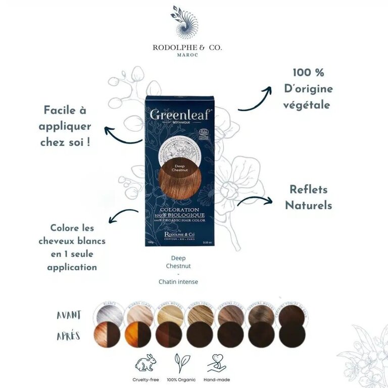 La coloration végétale Greenleaf Botanique de Rodolphe & Co est composée d'une formule unique à base d’ingrédients 100% végétaux qui garantit une couleur aux reflets naturels dans les valeurs de l’excellence et du respect de la coiffure professionnelle.