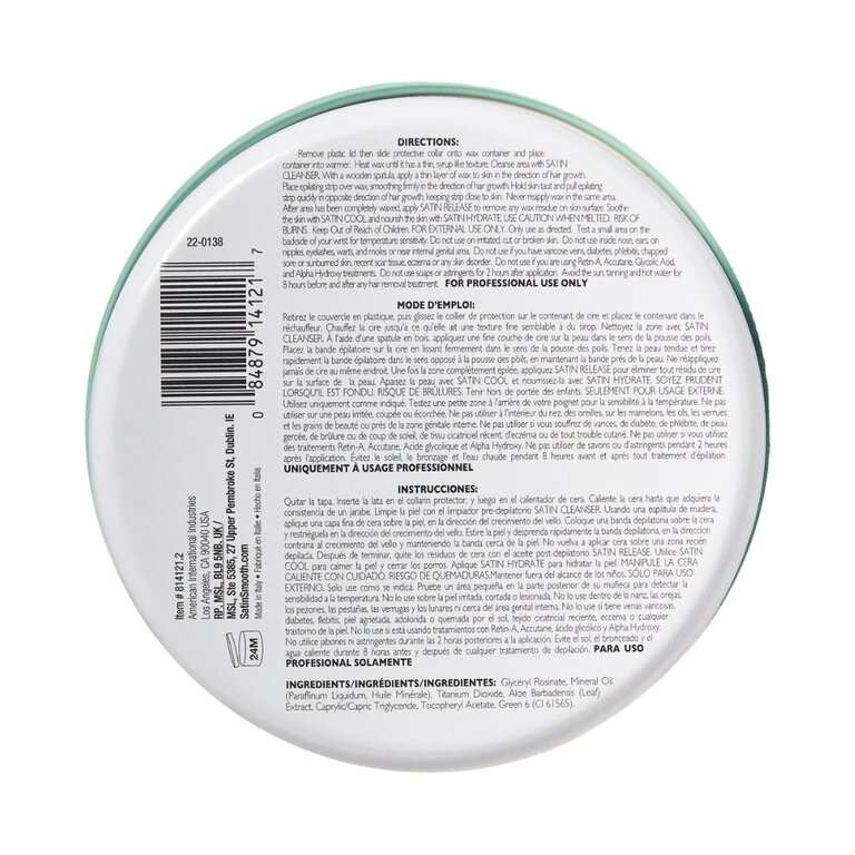 - Une fois la zone entièrement épilée, appliquez le soin Satin Smooth "Satin Release" pour éliminer tout résidu de cire.