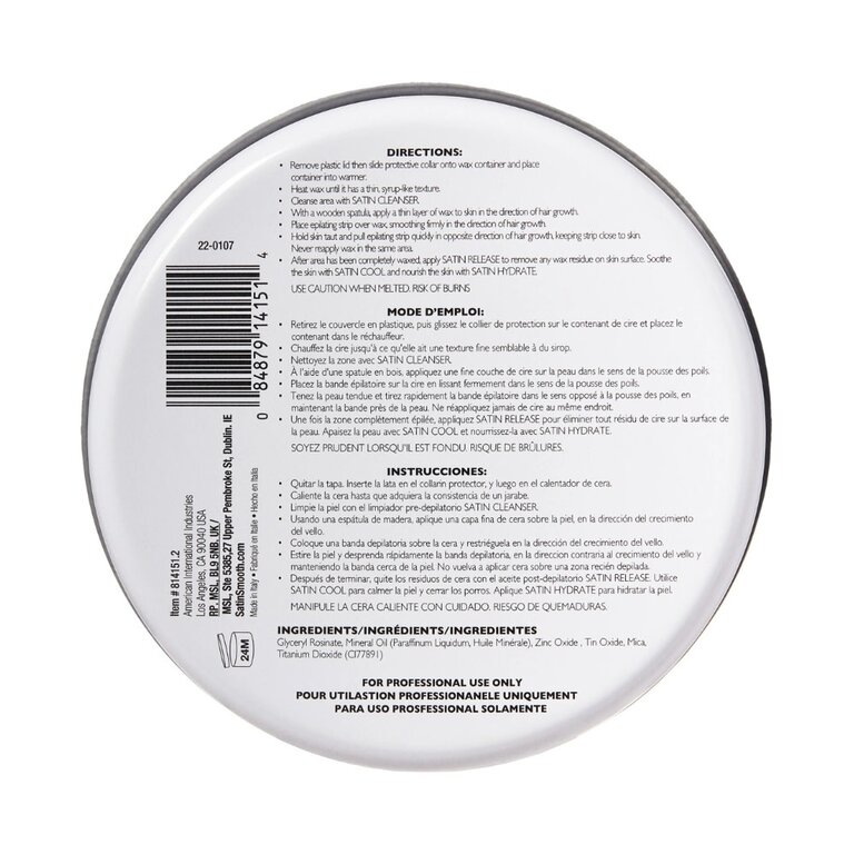 - Une fois la zone entièrement épilée, appliquez le soin "Satin Release" Satin Smooth. Pour éliminer tout résidu de cire sur la peau.