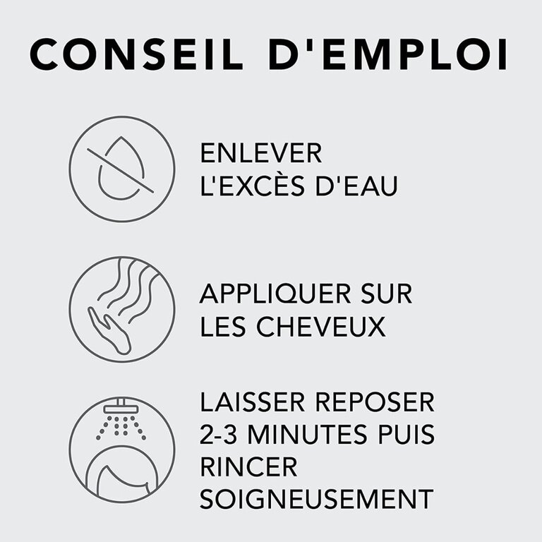 Après avoir fait le shampoing, essorer pour éliminer l'excès d'eau du cheveu. Appliquer uniformément sur les longueurs et les pointes en ciblant les zones les plus endommagées. Laisser agir 2 à 3 minutes et rincer abondamment.