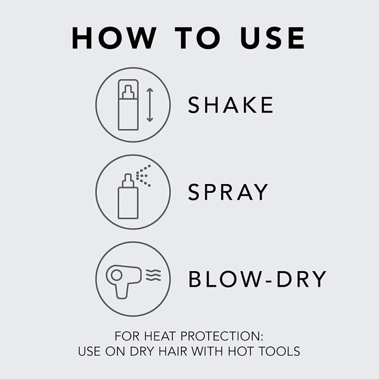 Sur cheveux secs : Vaporisez avec modération avant l'utilisation du fer plat ou du fer à boucler, pour une protection thermique et un lissage brillant.