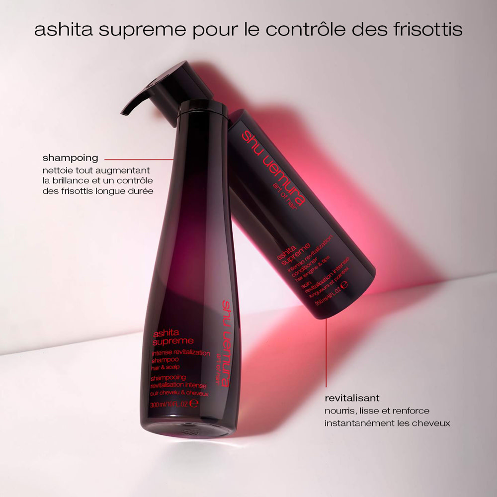 Découvrez le shampoing revitalisant intense "Ashita Supreme" de Shu Uemura, une formule douce et luxueuse qui métamorphose instantanément vos cheveux. Ils sont 16 fois plus lisses, 3 fois plus brillants, hydratés à 96% et durablement libérés des frisottis.