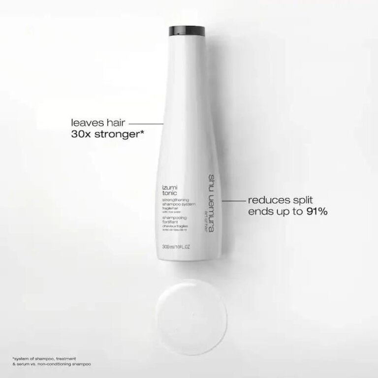 Le shampoing fortifiant "Izumi Tonic" de Shu Uemura nettoie en douceur, restaure et épaissit tous les types de cheveux fragiles. Formulé avec de l'eau de riz pour renforcer et réparer, il rend les cheveux plus forts et réduit considérablement les pointes fourchues. Ce shampoing nettoie en profondeur, mais en douceur tout en révélant des cheveux plus sains et plus lisses. Il présente une formule légère qui ne prive pas les cheveux de leur hydratation essentiel.