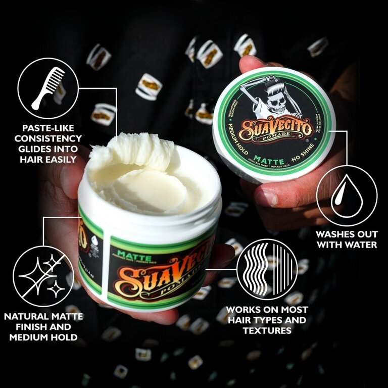 La "Matte Pomade" de Suavecito offre une finition naturelle sans brillance avec une tenue forte mais flexible. Conçue pour les styles modernes et texturés, cette formule à base d’eau vous donne du contrôle sans rigidité, pour un look travaillé en toute simplicité. Elle glisse dans vos cheveux sans effort et sans tirer, contrairement à certaines pommades traditionnelles. Facile à appliquer et à rincer, elle est idéale pour un style propre et mat qui dure toute la journée.