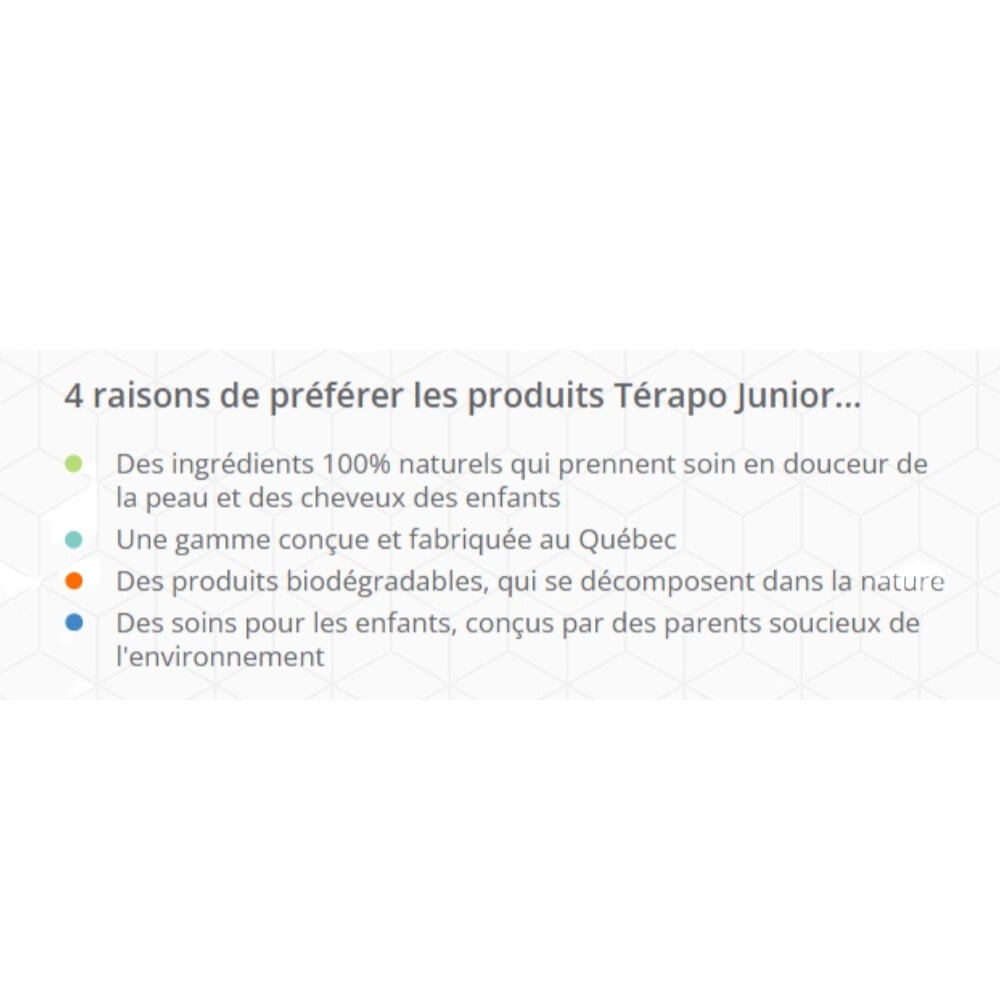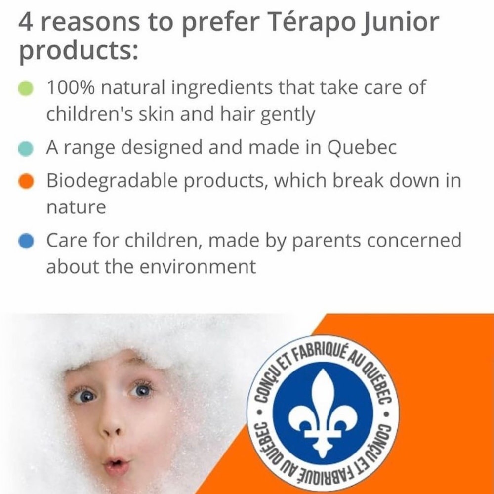 La gamme Térapo Junior est conçue spécialement pour les enfants de 0 à 9 ans. Elle respecte la philosophie et découle de la très renommée gamme Térapo Médik. Composée d’ingrédients naturels et sans aucun polymère ni silicone ajoutés. Avec les animaux de Térapo Junior, l'heure du bain devient plaisir complice.