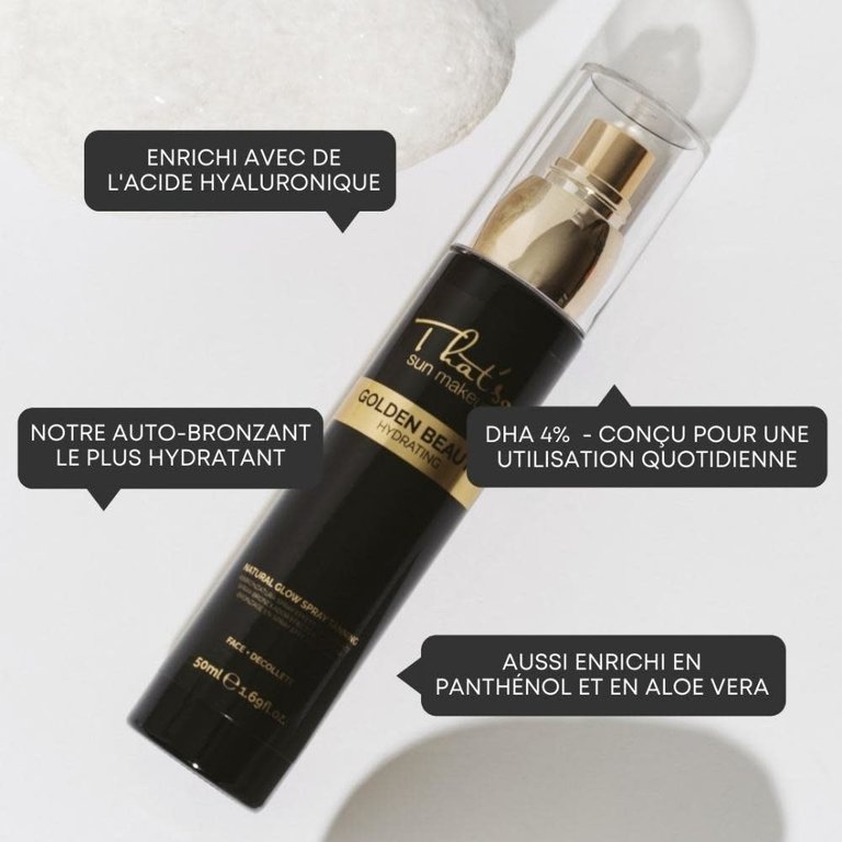 Le bronzage en vaporisateur "Golden Beauty Hydrating" de That'so a deux missions. D'abord, son utilisation procure une hydratation profonde et une action anti-âge complète à la peau. Deuxièmement, ce soin a aussi comme mission d'offrir un bronzage léger grâce à sa brume transparente. Pour un teint sain et éclatant qui dure environ 3 jours, laissez ce bronzage en vaporisateur faire le travail.