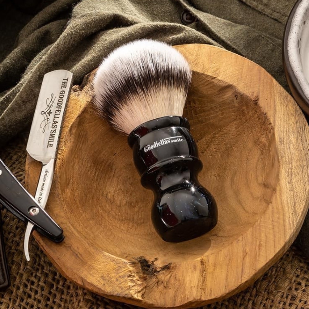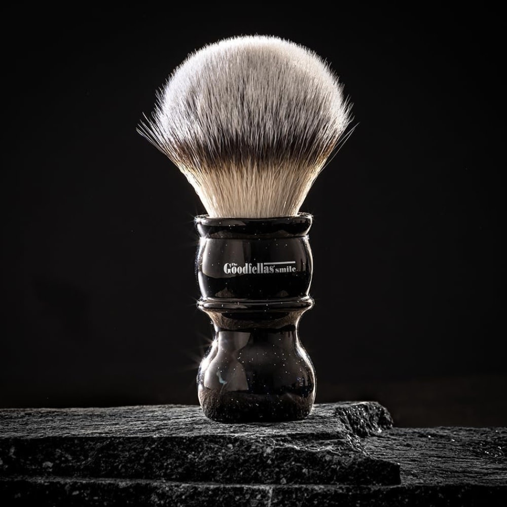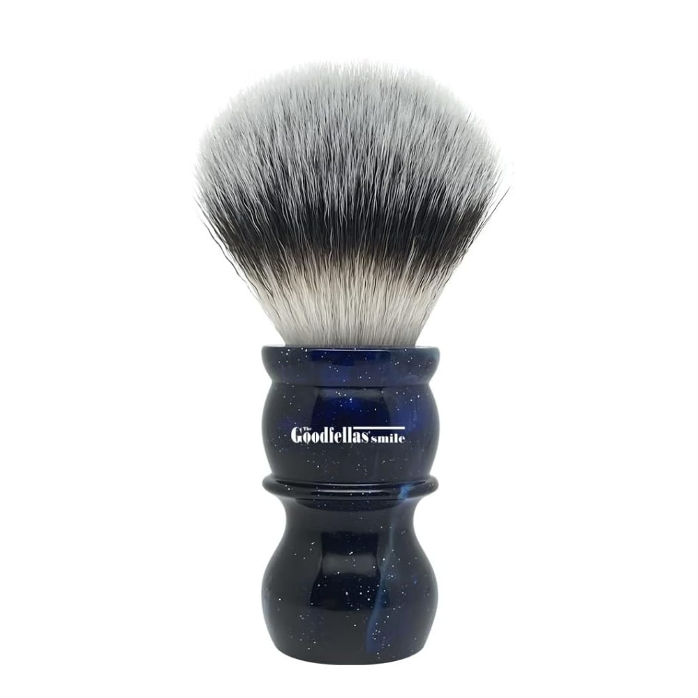 Le blaireau de rasage Galaxy de The Goodfellas’ Smile utilise des fibres synthétiques haute performance offrant une douceur remarquable et une création de mousse rapide et abondante. Sa flexibilité et sa densité assurent une application uniforme, une excellente glisse et un contrôle précis, même avec les savons les plus fermes.