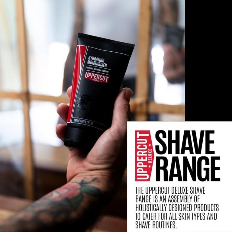 Pour un rasage impeccable : Utiliser le "Clear Shave Gel" ou la "Shave Cream" de Uppercut Deluxe, puis appliquer l’Hydrating Moisturiser pour apaiser et matifier la peau.
