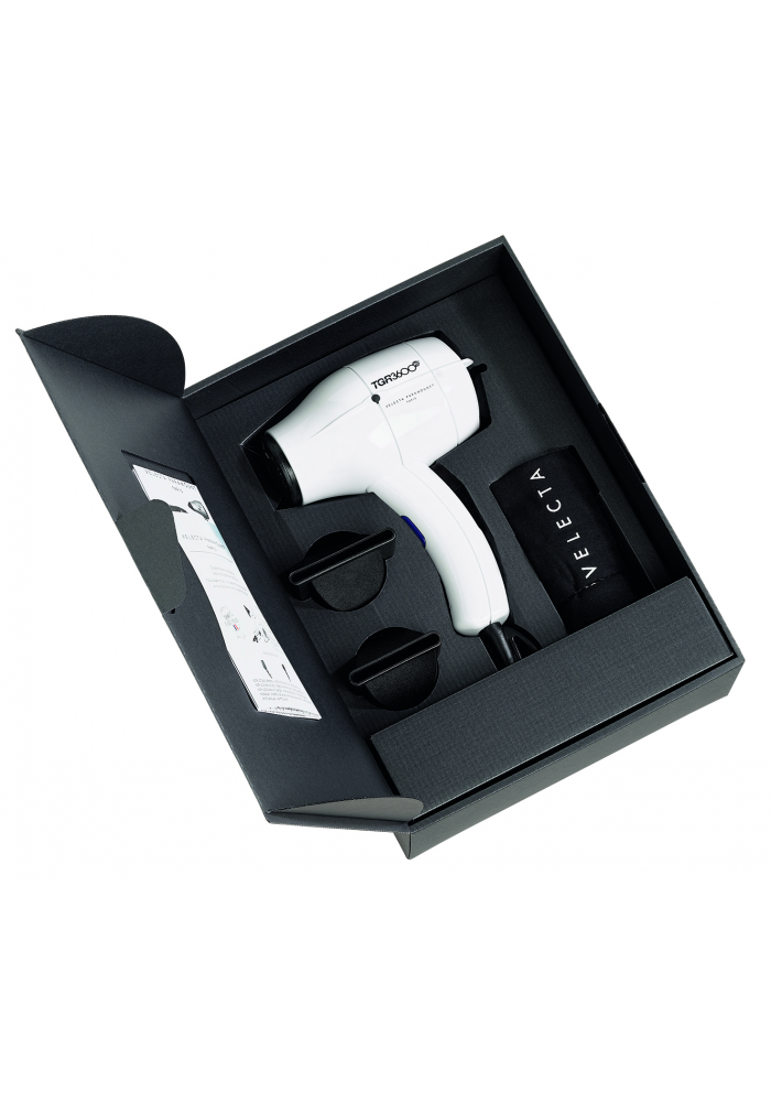 Le séchoir à cheveux TGR 3600-XS de Velecta Paramount Paris est compact, extrêmenent léger et silencieux. Malgré sa petite taille, il est aussi puissant qu'un séchoir régulier et surtout tellement facile à manipuler lors de votre mise en plis.