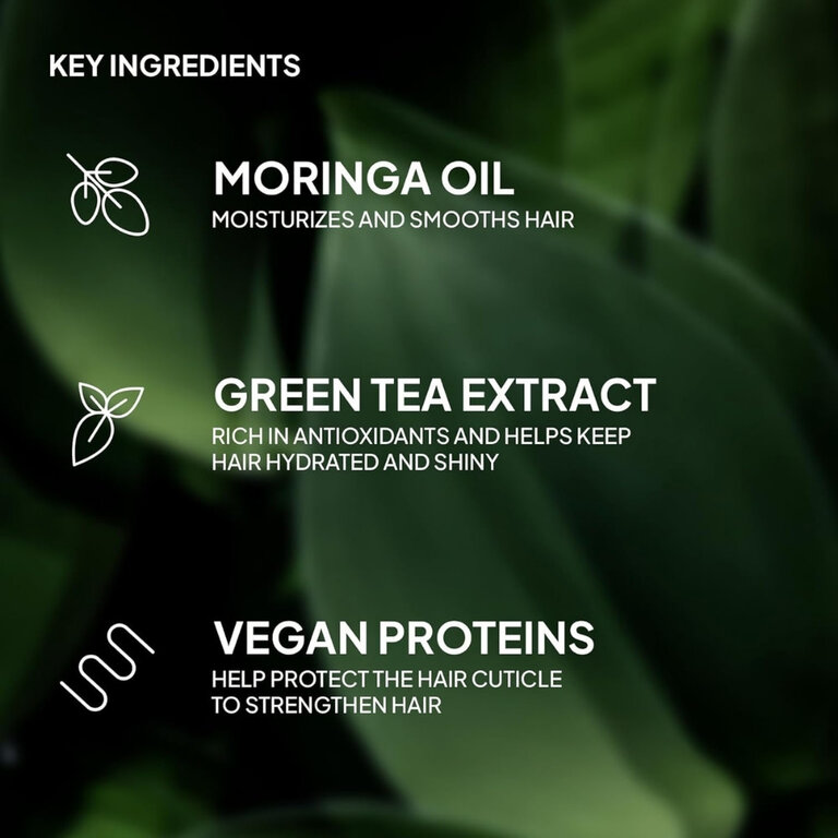 - Extrait de thé vert : Aide à protéger les cheveux contre les facteurs de stress environnementaux.