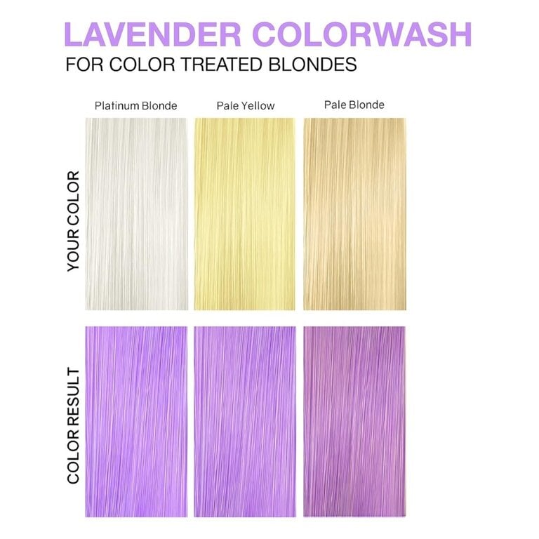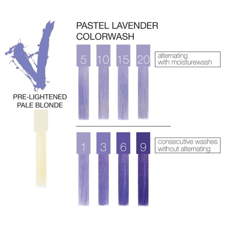 Le Shampoing nettoyant et colorant semi-permanent Viral Colorwash dépose un pigment de couleur Pastel Lavende sur des cheveux pré-éclaircis et blond clair pour créer une nouvelle couleur, maintenir ou rafraîchir la couleur.