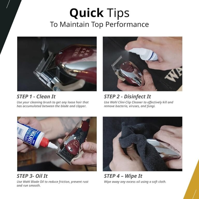 Utilisez le liquide de refroidissement "Blade Ice" entre deux clients pour éviter la surchauffe et maintenir une performance optimale. Pour un entretien complet, combinez avec une huile pour lames après la dernière utilisation de la journée.