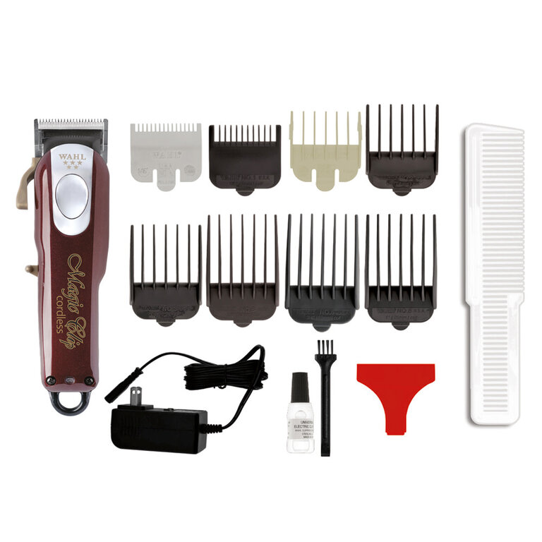 La tondeuse Magic Clip Série 5 étoiles de Wahl est conçue pour offrir les performances de précisions que les professionnels exigent avec la liberté d'une tondeuse sans fil. La magie est dans les lames! La Magic Clip sans fil est doté d'une lame 2161 à dents décalées de haute précision avec technologie crunch. Cet outil sans fil offre une vitesse et une facilité d'utilisation supérieures, un levier conique pratique pour un fondu et un amincissement faciles. Sa batterie lithium-ion offre une autonomie de 90 minutes par charge. Il a également une capacité de coupe avec le fil si désiré.