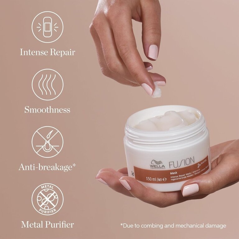 Le masque réparateur intense "Fusionplex" de Wella Professionnals est un soin luxueux qui offre une technologie qui pénètre les cheveux en profondeur dans le cortex et régénère instantanément les fibres au niveau microscopique et macroscopique pour aider à prévenir les cassures. Même les cheveux les plus endommagés ont un aspect renouvelé, plus lisse, plus fort et sont plus résistants aux cassures. Cette technologie est inspirée de la soie d'araignée, car elle est l'une des fibres les plus résistantes produites par la nature.