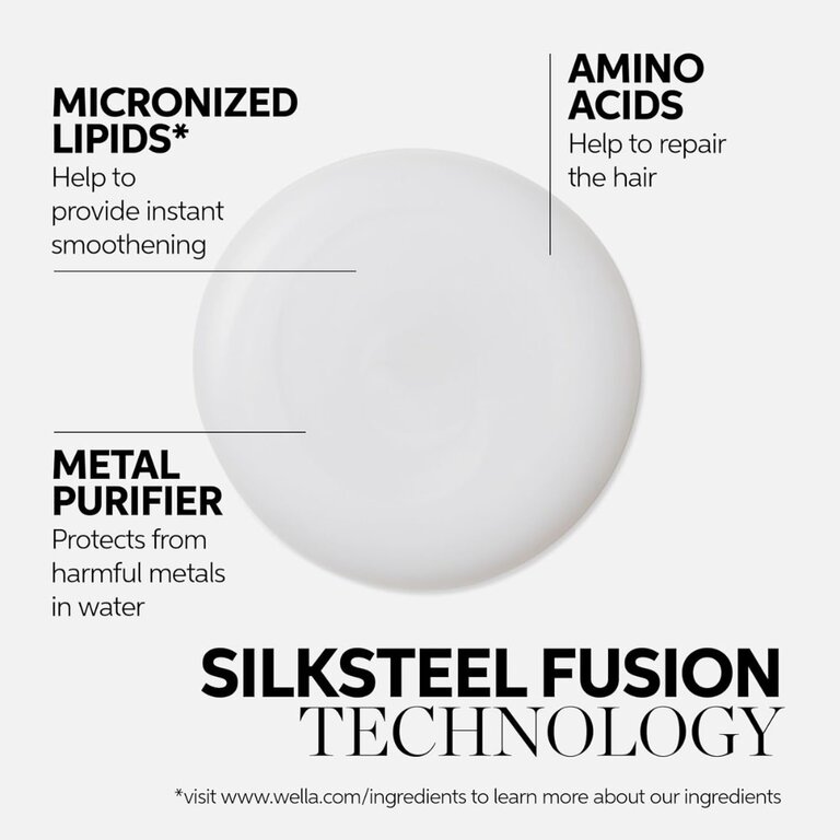 • Tecnhologie Silksteel Fusion : est une fusion entre les acides aminés et les lipides micronisés de soie qui pénètre dans le cortex et régénère instantanément les fibres au niveau microscopique et macroscopique. Protège les cheveux contre tout dommage excédentaire.